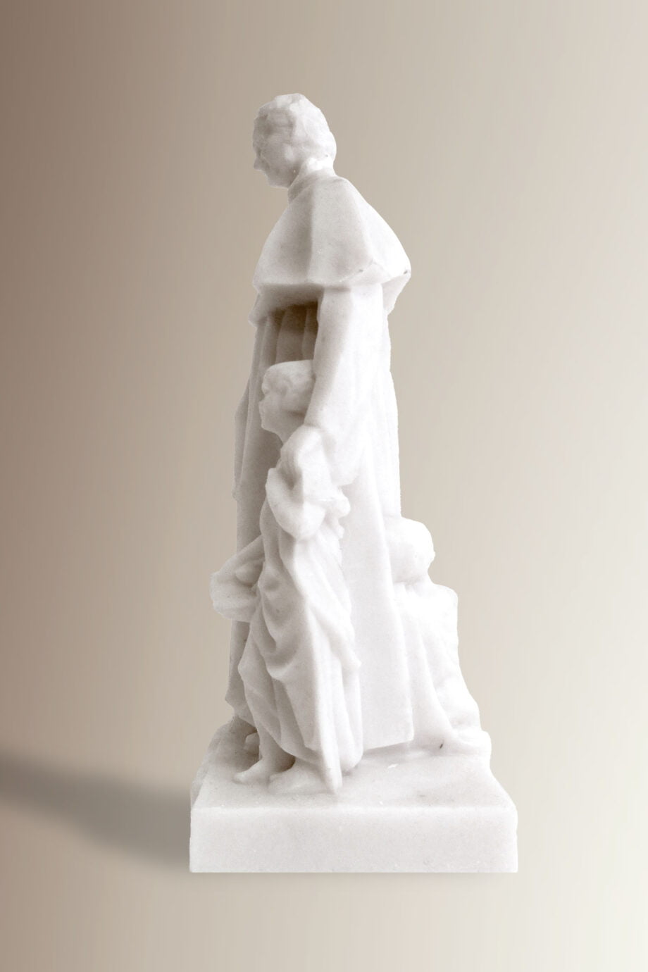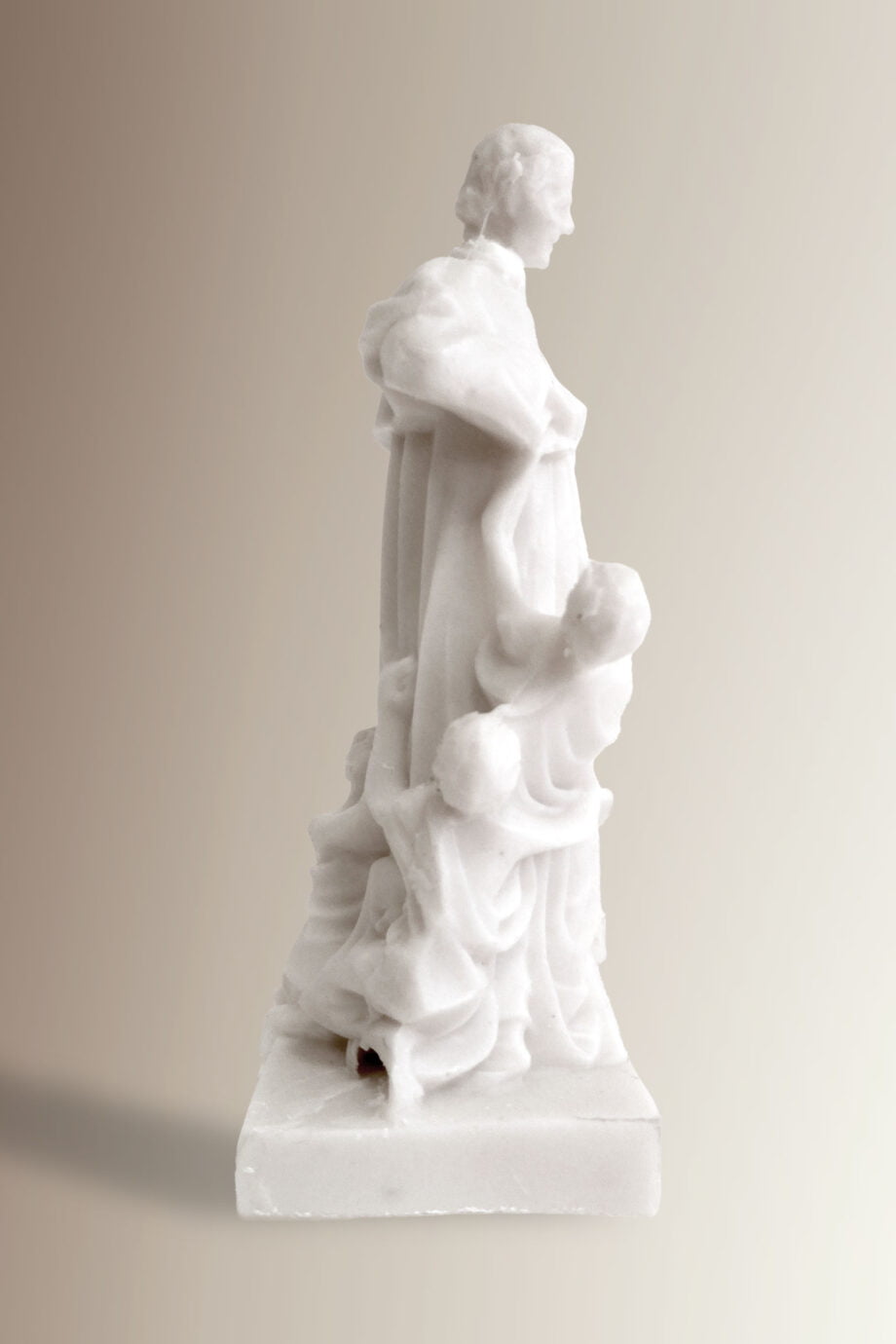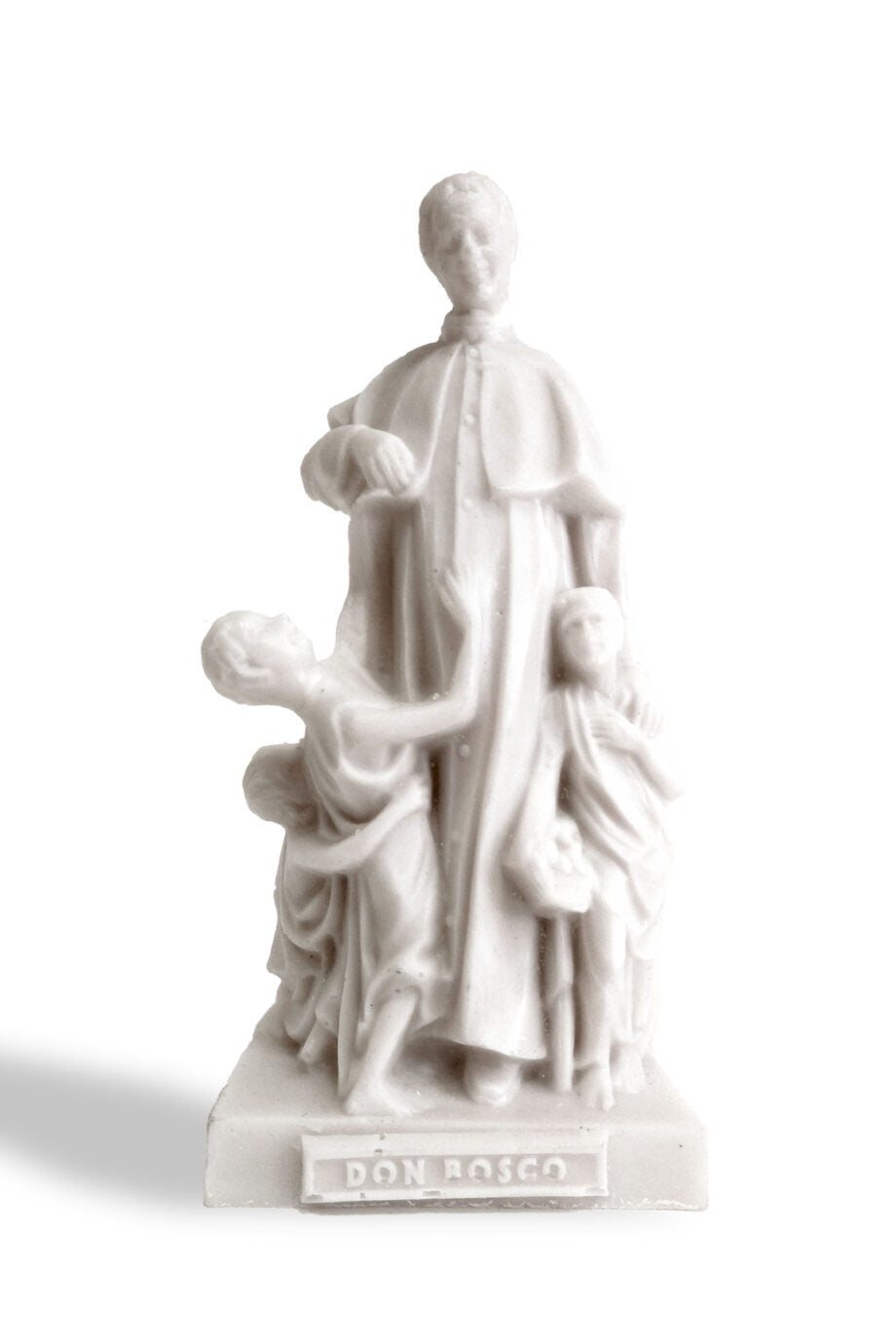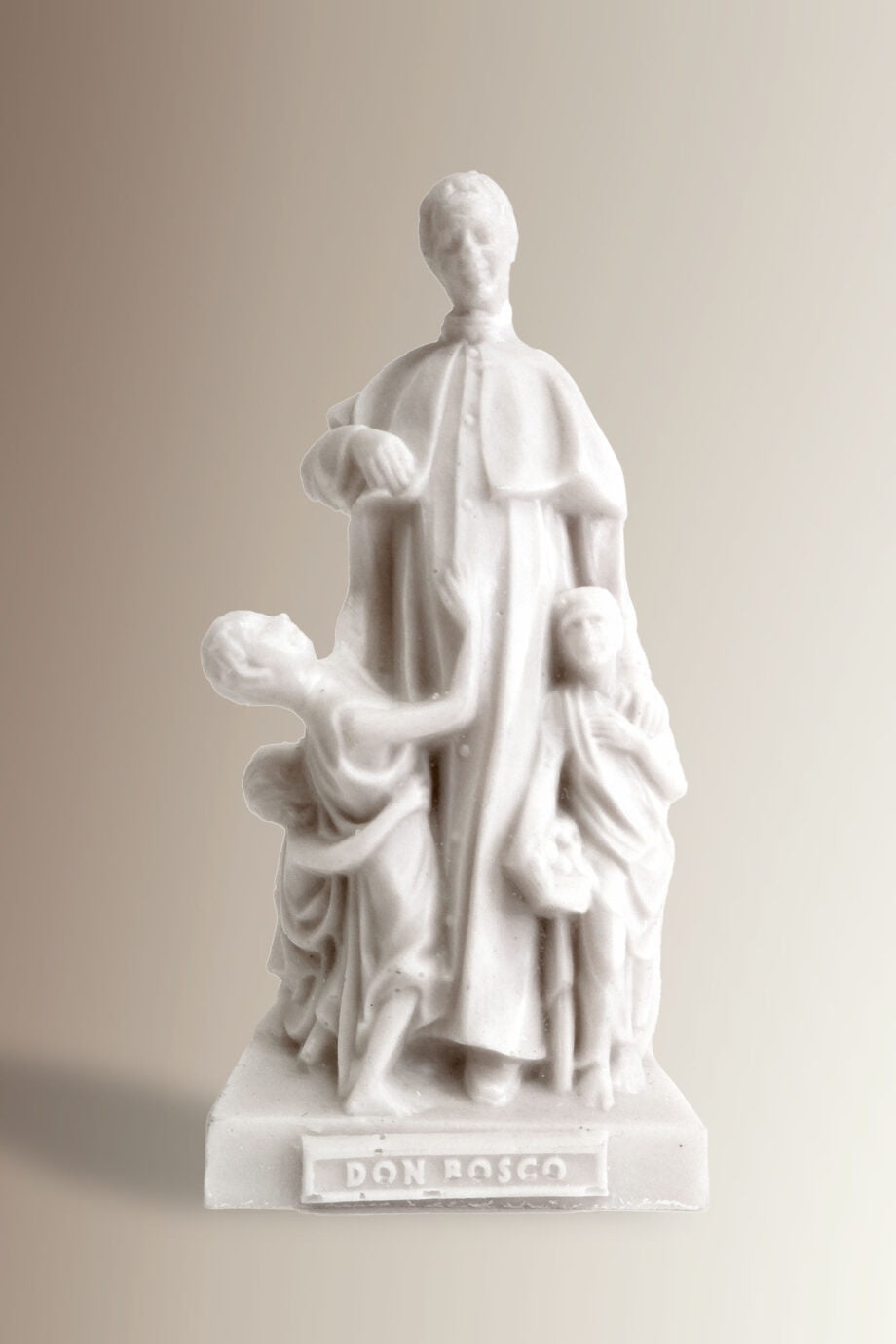 La miniatura riproduce fedelmente il monumento a Don Bosco che sorge a Valdocco, nella piazza antistante alla Basilica, dove Don Bosco portò il suo primo oratorio, fondò i Salesiani e visse fino alla sua morte. La statuetta è stata realizzata in polvere di marmo in Albania, nella casa salesiana di Scutari che vuole sostenere.